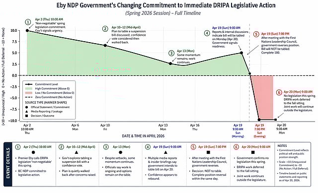 The Western Standard has produced the two charts tracking Premier David Eby’s plunging commitment to legislative changes to the Declaration on the Rights of Indigenous Peoples Act during the spring 2026 session to help readers better understand the chaos.