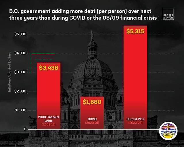 According to the Canadian think tank, the BC government is on track to add $5,315 in new debt per person over the next three fiscal years, which is more debt than was accumulated during the COVID pandemic ($1,680) and the 2008/09 financial crisis ($3,438) combined. These figures are adjusted for inflation.