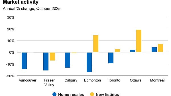 Hogue notes Vancouver, Fraser Valley, Calgary, Saskatoon, and Montreal experienced notable upticks in home resales in October from September, while Edmonton, Regina, Winnipeg, and Toronto recorded modest declines.