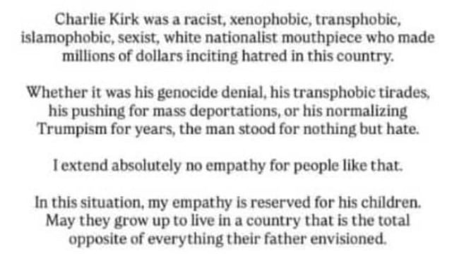 In an Instagram post, Fontaine described Kirk as “a racist, xenophobic, transphobic, islamophobic, sexist, white nationalist mouthpiece” and wrote, “I extend absolutely no empathy for people like that.”