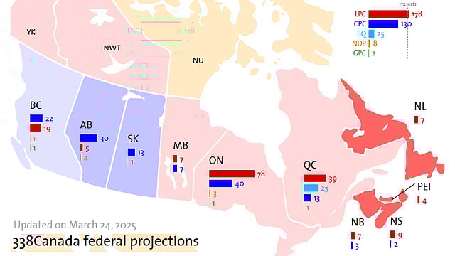 The site expects 178 seats for the Liberal Party of Canada (LPC), enough for a slim majority. The Conservative Party of Canada (CPC) are second at 130, followed by the Bloc Quebecois at 25, the NDP at 8, and Greens at 2.