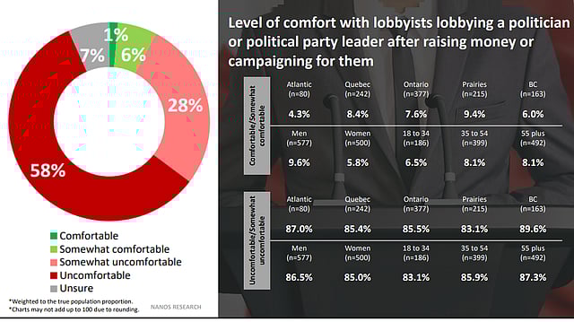 A national survey conducted by Nanos Research for Democracy Watch shows an overwhelming number of Canadians are uncomfortable about lobbyists campaigning for political parties that they subsequently lobby.