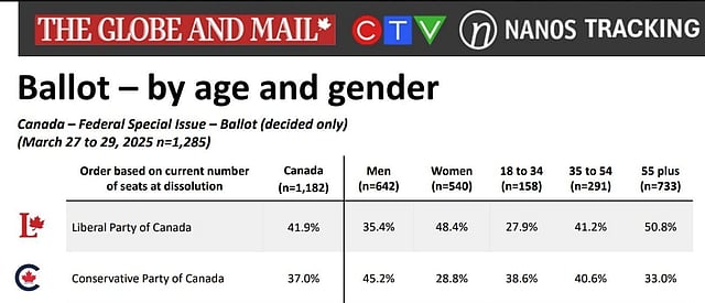 An Ipsos poll conducted March 24-26 for Global News found Carney holds a strong lead among Canadians aged 55 and older. Specifically, 50% of respondents in this age group chose Carney as the best pick for prime minister, compared to 34% for Poilievre. This points to a clear preference among older voters for Carney.