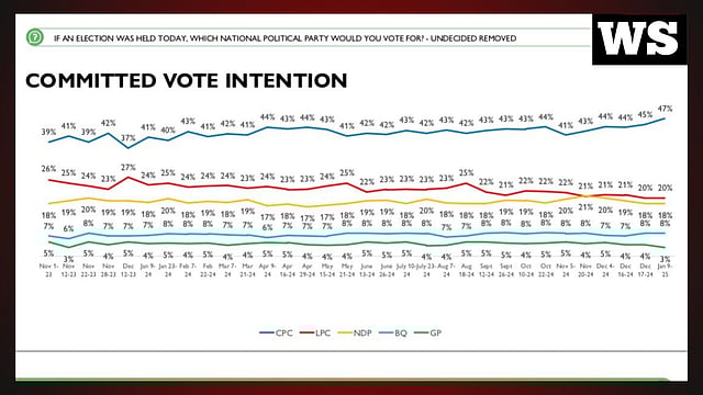 The survey was conducted the evening of Trudeau’s resignation announcement, January 6, to January 7. The pollster surveyed 2,500 voting-aged Canadians.