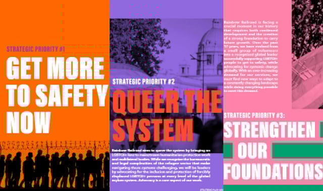The Rainbow Railroad website features a 2023-2026 Strategic Plan that includes three key steps: