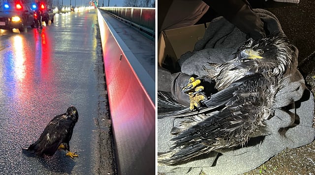 "An unusual rescue over the weekend when an injured eagle landed on the Lions Gate Bridge during rush hour," the West Vancouver Police Department wrote in a post on X. "WVPD & [the Vancouver Police Department] teamed up to safely capture this beautiful creature and bring it to [Orphaned Wildlife Rehabilitation Society] where it will be nursed back to health."