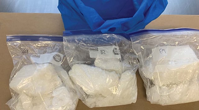 A search warrant executed at the location led to the seizure of 11.5 kilograms of methamphetamine, 500 grams of cocaine, $30,000 in cash, and high-end jewelry and designer handbags, which authorities believe were purchased with proceeds of crime.