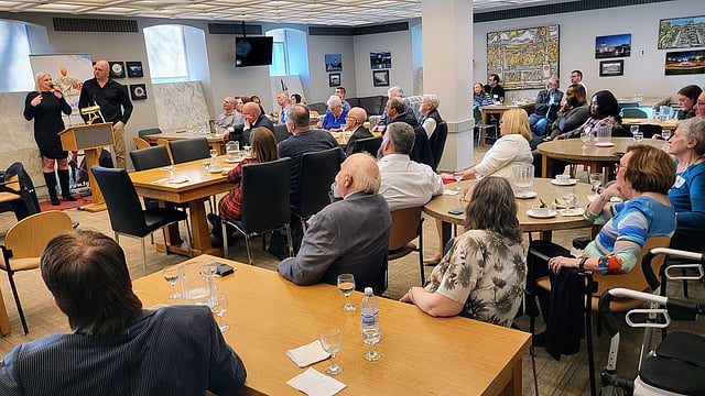 Brook and Vanessa Andres of Yorkton, spoke at the annual Full Gospel Business Men's Fellowship in Canada MLA Banquet. The event was held in the legislative cafeteria in Regina on April 9. Attendees numbered almost 70 and included Speaker Todd Goudy, seven other Sask Party MLAs, and Saskatoon NDP Keith Jorgenson.