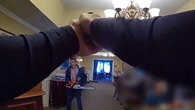 Just released bodycam footage of the December incident shows a police officer pointing his Taser at Escalera, yelling at him to put down the chainsaw.