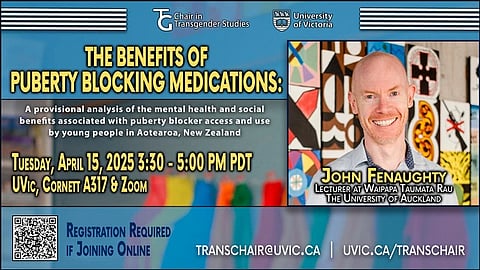 According to UVic's Chair in Transgender Studies, the event will feature New Zealand-based lecturer Dr. John Fenaughty, the lead researcher of the 2021 Identify Survey that claimed almost all those who took puberty blockers benefited from their effects.