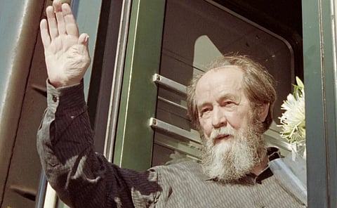 Russian dissident writer and Nobel prize winner Aleksandr Solzhenitsyn looks out from a train, in Vladivostok, summer 1994, before departing on a journey across Russia. Solzhenitsyn had returned to Russia after nearly 20 years in exile. As writer Paul Forseth points out, his critique of the moral condition of the West made nearly 50 years ago, now seems prophetic.Mikhail Evstafiev